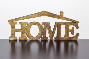 Bir özel ev ya da daire satın kavramı. Sarı bir arka plan üzerinde "ev" in ahşap mektup Word'le bir ev şeklinde Metal Anahtarlık. Yakın çekim.