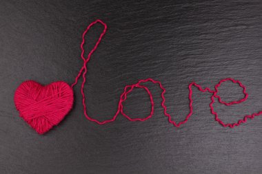 Ahşap arka plan üzerinde aşk yün metin ile el yapımı örgü kırmızı yün kalp
