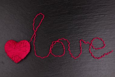 Ahşap arka plan üzerinde aşk yün metin ile el yapımı örgü kırmızı yün kalp
