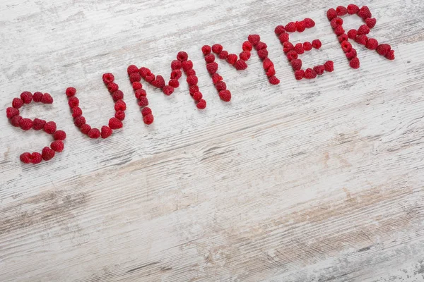 "ahududu meyveleri dokulu bir ışık ahşap arka plan üzerinde yapılmış yaz" kelime. Düz üst görünümü, metin için yer. Yat, alanı Kopyala.