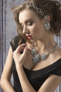 Güzel takı koyu arka plan, closeup üzerinde olan kadın