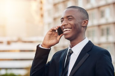 Şehir cep telefonu ile konuşurken genç Afro-Amerikalı işadamı gülümseyen portresi kapatın