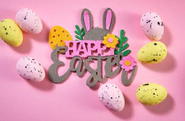 çizilmiş tavşan yüzleri ve kağıt kulakları ve mutlu Paskalya yazı ile tavuk yumurtası ile yumurta tepsisi tutan kadın kırpılmış görünümü