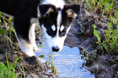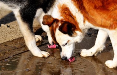 Portre bir köpek su birikintisi su içecekler