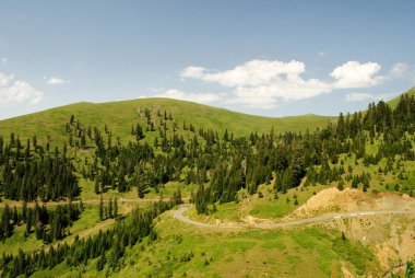 Dağ manzarası. Dağların eteklerinde, düz ve araba ile yol