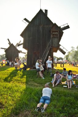 Gençlik, müzikal etno festivali "Obnovafest". 16 Ağustos 2019. Chernivtsi, Ukrayna. Birçok insan doğada dinlendirir. Çocuklar manuel motorlu eski bir atlıkarıncaya binerler..