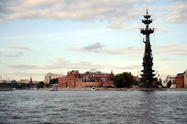 Moskova, Rusya 23 Mayıs 2018: Moskow (Moskva) Nehri ve Büyük Peter Heykeli, Rusya. Turistik zevk teknesinden manzara. Zurab Tsereteli tarafından tasarlanmıştır. 1997 yılında dikildi