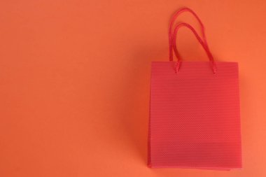 Kırmızı arka planda büyük kırmızı alışveriş kağıt torba. Alay etmek.