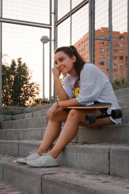 Yaz günü oyun alanında kaykay üzerinde oturan güneş gözlüğü atletik esmer kız Görüntü