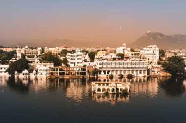 Udaipur şehri sabah Pichola Gölü 'nde, Rajasthan, Hindistan. Şehir sarayının manzarası göle yansıyor.