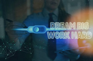 Dream Big Work Hard gösteren kavramsal el yazısı. Kendinize İnan ve hayalleri ve hedefleri takip İş fotoğraf vitrin.