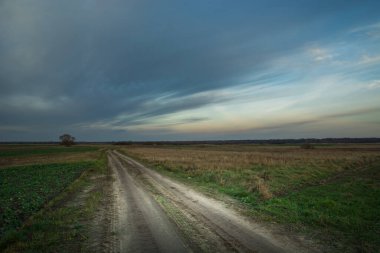 Toprak yol, uzun otlar ve gün batımı, akşam bulutları,