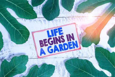 Kelime yazma metni Hayat Bahçede Başlıyor. Tarım Santrallerinin büyüyen iş konsepti Bahçe Meydanı dikdörtgenini sevmek gerçek dışı ahşap karikatür ahşap renkli duvara asılı.