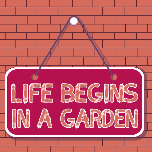 "Hayat Bahçede Başlıyor" yazısını gösteriyor. Kavramsal fotoğraf Tarım Bitkileri bahçıvanlık için sevgi büyüyen Renkli hatırlatma boş tahta boş boşluk arkaplan dikdörtgen ekleyin.