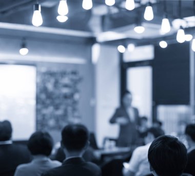 Kurumsal konferansta seminer sunucusu konuşma yapıyor. Konuşmacı iş izleyicilerine ders veriyor. Şirket eğitimi etkinliği sırasında salonda tartışma yürüten yönetici.