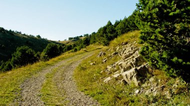 Bulgaristan 'ın Sofya bölgesindeki Zhelyava köyü yakınlarındaki Balkan dağında güzel kozalaklı ve yaprak döken orman, farklı çimler, şelale ve toprak yol ile taze açıklık