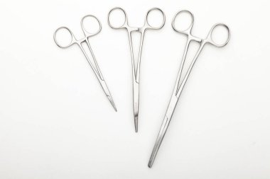 Çelik cerrahi aletler ve laboratuvar ekipmanları beyaz arka planda izole edilmiş. Profesyonel klinik aletleri. Tıbbi, cerrahi, ambulans ve veteriner konsepti. Yumuşak seçici odaklı yakın plan