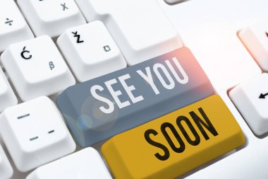 Kelime yazma metni. Yakında görüşürüz. Biriyle vedalaşmak ve tekrar buluşmaya gitmek için kullanılan iş fotoğrafı sergisi. Klavye ve durağanlık yakınlarındaki siyah bilgisayar ekranına yapıştırılmış not kağıdı.