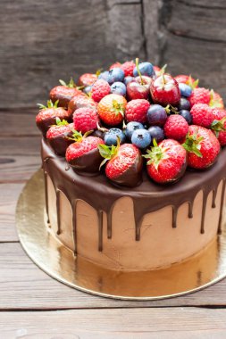Erimiş çikolatalı kek, taze çilek, ahududu, yabanmersini ve kırsal kahverengi arka planda üzüm..