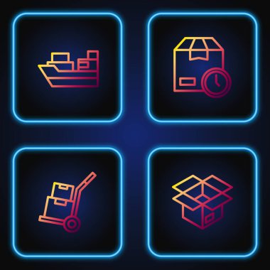 Hattı kurun kargo kamyonu, karton kutuda pizza paketli teslimat aracı ve karton kutulu teslimatçı. Renk simgeleri. Vektör