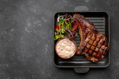Ahşap masada nefis ızgara pirzola, üst manzara. Metin için boşluk