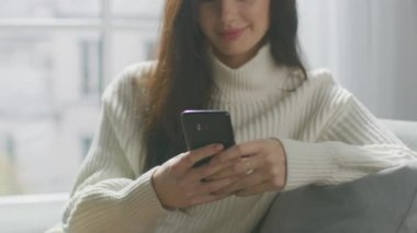 Businesswoman using mobile phone at workplace. Smiling woman browsing internet
