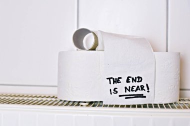 "Tuvalet kağıdı istiflemeyi bırak "tuvalet kağıdı rulosunun üzerinde - Corona krizinde tuvalet kağıdı istiflemek için konsept