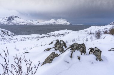 Kış mevsiminde Lofoten balıkçı köyünün en iyi manzarası, Norveç, İskandinavya, Avrupa