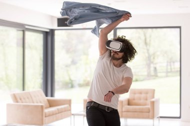 Kıvırcık adam evde sanal gerçeklik kulaklığıyla video oyunu oynuyor.