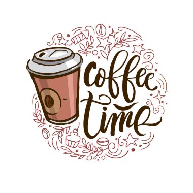Her zaman kahve zamanı. Beyaz arkaplanda siyah bir yazı var. Sevimli tebrik kartı, harf ve el yazısı tarzında yapıştırma ya da yazdırma.