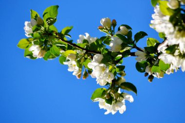 Metin için yeri olan mavi arkaplanda çiçek açan elma ağacı resmi