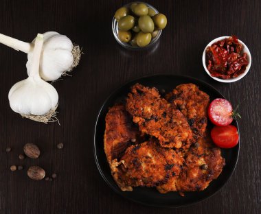 Fırında Tilapia balığı ve domates tabağı. Siyah arka plan. Üst Manzara. Boşluğu kopyala.