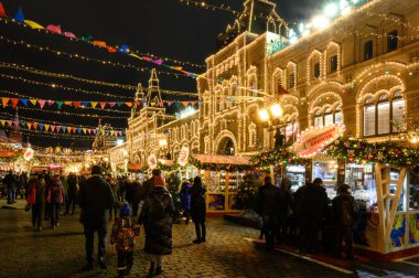20 Aralık 2019. Moskova, Rusya. Moskova 'daki Sakız binasının önündeki kırmızı meydanda süslenmiş Noel ağacı..