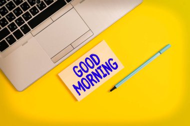 Tahta küplerdeki harflerle günaydın mesajı. Malzemelerle dolu çalışma alanı. Düz gri yüzey, bilgisayar klavyesi ve spiral not defteriyle yatıyordu. Sabah tebrikleri ve motivasyon.