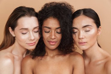 Beyaz arka planda soyutlanmış, birbirine sarılan üç genç kadının portresi.