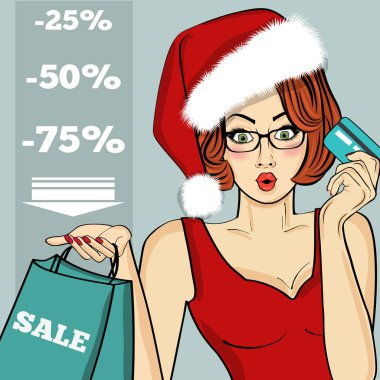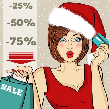 Elinde alışveriş torbaları olan siyah Afrikalı Amerikalı Noel Baba kız. Alışveriş yapan kadın. Noel indirimi afişi. Düz bir tarzda kadın artı boyut.