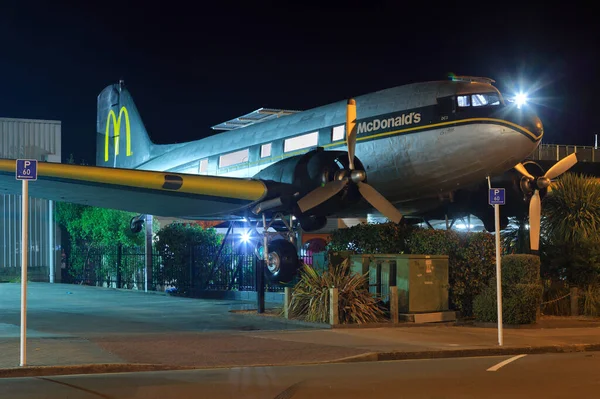 "McDonald 's" uçağı, Taupo, Yeni Zelanda, gece. Müşteriler bu eski Douglas DC3 uçağının gövdesinin içinde yiyebilir. 23 Mayıs 2020
