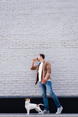 Kağıt bardaklı adam Jack Russell Terrier 'ı şehir caddesinde tasmalı gezdiriyor.