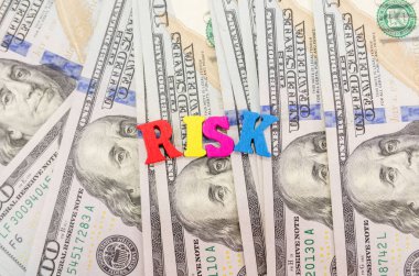 Dolar arkaplanındaki tahta küplerde "risk" kelimesi. Yukarıdan bak. Mali konsept.