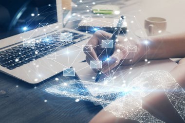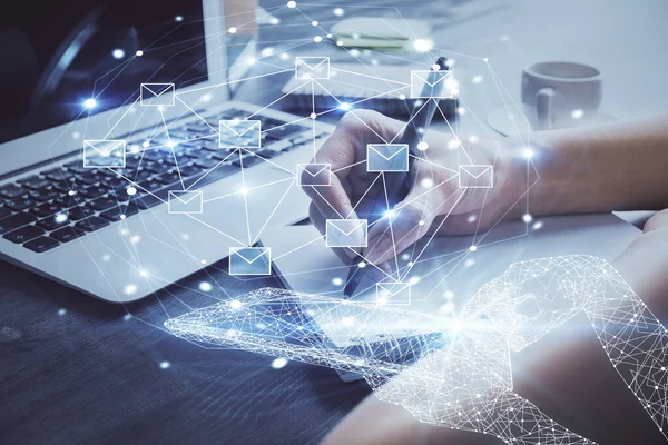 E- posta ile soyut zarf çizimi, ellerin üzerinden not alarak. Elektronik posta kavramı. Çift pozlama