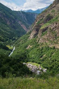 Dağdaki ağaçların ve çalıların farklı türleri vardır. Dağ yamacında bir kasaba vardır. Gökyüzünde bulutlar vardır.