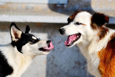 Pomsky parkta bir Shetland çobanıyla oynuyor..