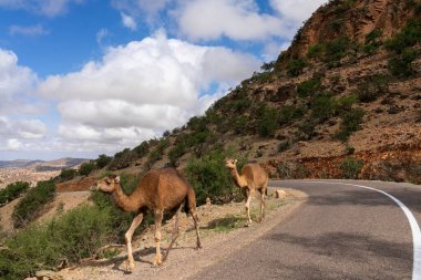 Fas yolunda yürüyen deve sürüsü. Guelmim, Fas 'taki deve pazarına giderken kamburu çıkmış bir deve sürüsü..