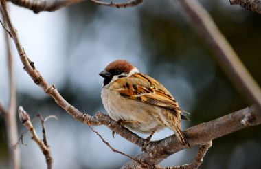 Sonbahar mevsiminde bir ağaç dalına tünemiş yetişkin erkek serçenin portresi.