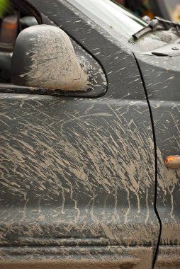 Kirli araba cipi, cam sileceği ile kaplanmış kuru toz tabakasıyla kaplıydı. Reklam amaçlı oto yıkama için fotokopi alanı vardı, kimse yoktu..