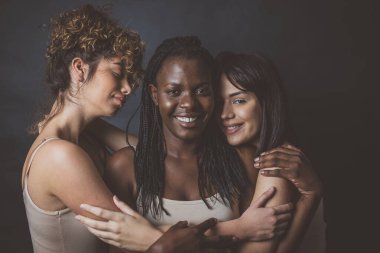 Kafkas ve Afrikalı iki uyuklayan kadın kameranın önünde duran uzun saçlı muhteşem Asyalı kızın önünde eğiliyor.