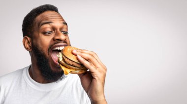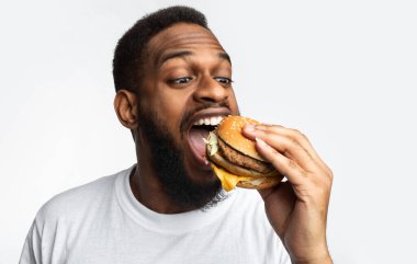 Beyaz arka planda durup hamburger yiyen komik, aç Afrikalı adam.
