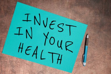 Healthy lifestyle symbol. Hand in blue glove, white card with words 'your health is an investment not an expense' and stethoscope. Medical and healthy lifestyle concept.