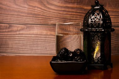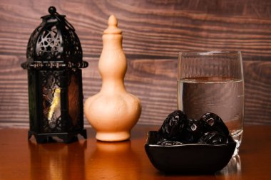 Ahşap arka planda fener bulunan ajwa tarihlerinin seçici odak noktası. "Ajwa" tarihleri Hz. Muhammed 'in en büyük sevgisidir..