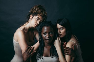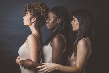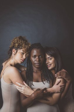 "Vücut pozitifliği" için stüdyoda poz veren farklı etnik kökenli üç kız.
